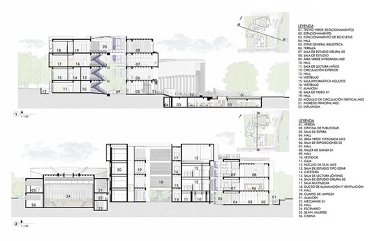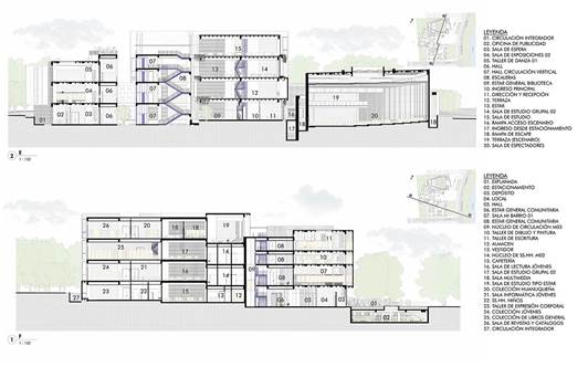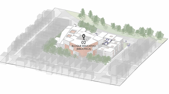 Con este fin, se organizan áreas específicas, que abarcan desde zonas proyectadas para el público infantil lector hasta ambientes adaptados para personas adultas mayores, distribuidas en los niveles inferiores del bloque 02 para garantizar una accesibilidad apropiada. De igual manera, se integra una biblioteca pública provista de salas para la lectura colectiva e individuales, concebidas para estimular el aprendizaje de manera independiente e incentivar el intercambio de conocimientos.